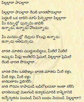 pillallaaraa paapallaaraa - daaSarathi pillallaaraa paapallaaraa raepaTi bhaaratapourullaaraa peddalakae oka daarini chuupae pinnallaaraa pillallaaraa mee kannulloa punnami jaabili unnaaDu, unnaaDu pomchunnaaDu. mee manassulloa daevuDu koluvai unnaaDu. unnaaDu ataDunnaDu. bhaarata maataku muddulabiDDalu, meeraelae meeraelae ammaku meepai amtaelaeni praemalae, pillallaaraa praemaelae raepaTi bhaarata pourullaaraa... bhaarata daeSam okaTaeillu bhaarata maataku meerae kaLlu, meerae kaLlu, meerae kaLlu jaatipataakam paikegaraesi jaati gouravam kaapaaDamDi baDiloabayaTaa amtaa kalisi bhaarateeyulai melagamDi kanyaakumaariki kaaSmeeraaniki anyoanyatanu pemchamDi veeDani bamdham vaeyamDi. pillallaaraa!! |