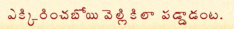 ![]() emcha boatae mamchamamtaa kamtalae. Meaning : while inspection the whole bed is full of holes. Explanation : ![]() emchina eruvaedii amTae yajamaani paadamae. Meaning : Explanation : ![]() emtavaaralayinaa kaamtadaasulae. Meaning : Great people may be, but slaves to a lady's charm. Explanation : ![]() emdukuraa ogarpu amTae ellumDi samtaku poavaali gadaa! annaaDaTa. Meaning : why are you ready? means aren't we going to market day after tommorrow said the man. Explanation : ![]() ekkaDayinaa baavagaani vamgatoeTakaaDa maatram kaadu. Meaning : Explanation : ![]() ekkaDunnaavae kambaLi amTae vaesina choaTanae unnaa vemgaLii annadaTa. Meaning : Where are you blanket, means the same place you have left me. Explanation :You need to pick up your own mess, no one is going to do it for you. ![]() emDakaachina choaTae vennela kaachaedi. Meaning : Where ever the sun shines, that's where the moon will shine. Explanation :where ever there is sorrow there will be happiness ![]() ekkirimchaboayi vellikilaa paDDaaDamTa. Meaning : Started to tease but stumble on your own feet. Explanation : don't do anything which you cannot handle yourself. If you try to embarrass others, you might find yourself in the same position... well sounds like the theme of a Hollywood teen movie. ![]() evarigoatiloa vaarae paDaTaaru. Meaning : who ever digs a grave will fall in it themself. Explanation : Never try to harm others, who knows you might be the one to get hurt. ![]() elukaku pilli saaksham cheppinaTTu. Meaning : A cat giving an alibi to a mouse. Explanation : ![]() enuboatu meeda vaana kurisinaTTu. Meaning : Like raining on a wild boar. Explanation : the rain won't even bother if it rains on it, so do some people don't mind any sort of disrespect as long as they get what they want. ![]() aeTi eetaku lamkamaetaku sari. Meaning : Swimming in a river, and feasting in 'lanka' is enough Explanation : Lanka, is a place in the Epic story Ramayana, where the evil king rules. It is said to be inhabited by rakshasas, literally meaning deamons. But 'rakshasa' is casually used in stories to define bad people. ![]() egadeesae brahmahatya digadeestae goahatya. Meaning : Explanation : ![]() eddunu aDigaa gamta kaTTaedi? Meaning : Do we ask the bull to tie a bell around it? Explanation : ![]() eddu pumDu kaakiki muddaa! Meaning : Does wound of bull make the crow happy. Explanation : ![]() eranu chuupi chaepanu laaginaTTu. Meaning : Like catching the fish using a bait. Explanation : ![]() evariki vaarae yamunaa teerae. Meaning : All people are for themself. Explanation : ![]() evari verri vaariki aanamdam. Meaning : Each person's insanity is his happiness Explanation : I have heard somewhere that a person has to be a little insane to be sane. Does that make any sense, well to be frank it does. ![]() ae emDaki aa goDugu. ae gaaliki aa chaapa. Meaning : To every summer day there is an umbrella. to every wind there is a sail. Explanation : ![]() aeku ayivacchi maeku ayina teeru. Meaning : Explanation : ![]() aekulu peDitae buTTa chinugutumdi. Meaning : Put nail and the basket will tear. Explanation : ![]() ae guuTi chilaka aa guuTi paluku palukutumdi. Meaning : A parrot speaks the language of its natives. Explanation : Everyone keeps their nativity in their hearts, and talk accordingly. ![]() ae puTTaloe ae paamumdoa! Meaning : Who knows which pit has what snake Explanation :look before u leap sort of saying. ![]() aemee laeni vistari egiregiri paDutumdi, annee unna vistara aNigiimaNigii umTumdi. Meaning : A banana leaf which is not served will twitter, while a fully served one stays still. Explanation : A learned man will keep his calm. ![]() aeru daaTina taruvaata teppa tagalaesinaTTu. Meaning : Destroying the boat after reaching the other end. Explanation : ![]() aeTloa vaesinaa emchi paara vaeyaali. Meaning : Even when throwing in the cannal, think before doing it. Explanation : ![]() aeTi aavali mutyaalu taaTikaayalamta annaTlu. Meaning : Explanation : ![]() aepaaTu tappinaa saapaaTu tappadu. Meaning : Any work may be skipped but not eating. Explanation : ![]() aenugu meada doama vaalinaTlu. Meaning : Like a fly on an elephant Explanation : | ||||||||||