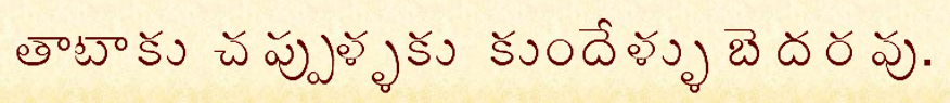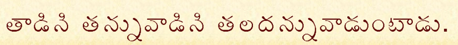 ![]() taDi guDatoa gomtukoayuTa Meaning : To strangle with a wet cloth. Explanation : ![]() tanadaakavastaegaani talanoppi baadha teleedu! Meaning : Explanation : ![]() tannitae buurela gampaloa paDDaTTu. Meaning : To fall in a basket of sweets when kicked. Explanation : ![]() tannumaalina dharmam modalu cheDDabaeram. Meaning : Not to think of one self is the first problem. Explanation : ![]() tala taakaTTu peTTuTa. Meaning : To loan your head. Explanation : ![]() talapaagaa chuTTaTam raaka tala vamkaranaTTu. Meaning : Saying that the head is wrong because the does not know how to tie a turban. Explanation : ![]() tala praaNam toakaku vacchuTa. Meaning : Life in the head come to tail(to be tired a lot) Explanation : ![]() talupu laeni imTloa kukka duurinaTTu. Meaning : A dog entering a gate less house. Explanation : ![]() tana balamu kannaa sthaana balamu minna. Meaning : The strength of the area is more than personal strength. Explanation : ![]() talli peTTelu menamaama daggara pogiDinaTTu. Meaning : To praise mothers treasure infront of her brother Explanation : ![]() talli guuni daitae pillaguunidounaa! Meaning : If mother has a hunch will the daughter too have it! Explanation : ![]() talliki kuuDaa peTTani vaaDu pina talliki cheera peTTaaDaTa. Meaning : Who does not even spend on mother bought a saree for her sister. Explanation : ![]() taacheDDa koati vanamella cherachinaTTu. Meaning : The bad monkey made every other monkey in the park bad Explanation : ![]() taaTaaku chappuLLaku kumdaeLLu bedaravu. Meaning : Rabbits do not get scared if the leaves shake Explanation : ![]() taaDi cheTTukimda paalu taaginaTTu. Meaning : To drink milk under the palmyra (taati chettu) tree Explanation : The milk of palmyra is white and is liquor so who would belive you are drinking milk ![]() taaDini tannuvaaDini taladannuvaaDumTaaDu. Meaning : If You can beat someone then there is someone else who could beat you. Explanation : ![]() taataku daggulu naervavalenaa! Meaning : To teach an oldman to cough Explanation : ![]() taanu paTTina kumdaeluki muuDae kaaLLu. Meaning : The rabbit he caught has only 3 legs. Explanation : ![]() taanu valachimdi rambha, munigimdi gamga. Meaning : The girl he liked is 'rambha'(apsara), the one he drowned is 'ganga' Explanation : ![]() taanikaTi talistae daivamokaTi talachunu. Meaning : Man thinks of something but god thinks another. Explanation : ![]() tinaboatuu ruchi aDaganaela! Meaning : Why ask for taste when you are about to eat! Explanation : ![]() tinna imTi vaasaalu lekka peTTinaTTu. Meaning : To count the rods in a house you just ate.(meaming being disloyal Explanation : ![]() timDiki mumdu taguvuku venukaku. Meaning : First to eat, last to fight. Explanation : ![]() tilaa paapam taloa piDikeDu. Meaning : Explanation : ![]() teega laagitae Domkamtaa kadilinaTlu. Meaning : Explanation : ![]() tupaaki kaDupuna Phiramgi peTTinaTlu. Meaning : To feed the gun a canon ball. Explanation : ![]() teDDu vumDagaa cheYYi kaalchukunnaTlu. Meaning : Explanation : ![]() traaDu chaaladani baavi puuDchukonnaTlu. Meaning : To close the well, as the rope is not long enough. Explanation : ![]() tulasi vanamloa gamjaayi mokka. Meaning : A cocaine plant in a 'tulasi' garden. Explanation : ![]() tegimchina vaaniki teDDaelimgam. Meaning : Explanation : | ||||||||||