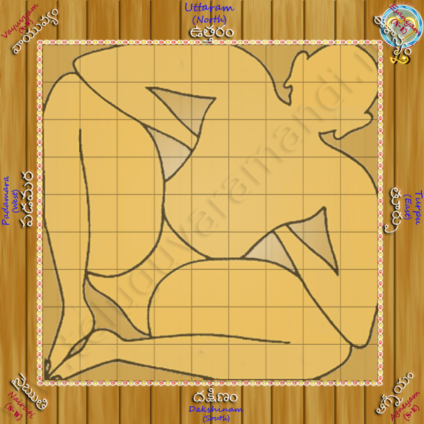 This spirit fell with its head in the Esanyam (North-East), and feet towards (South-West) and hands in Vaayuvya (North-East), and Agnaeya (South-East). The Devas, Gods seated themselves on the spirit so that it cannot get up again in the following manner.